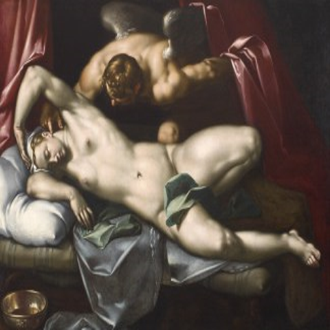 Mais Cupidon tombe amoureux de la belle Psyché, qui est emportée dans un magnifique palais. Cependant Cupidon lui interdit de chercher à connaître son identité. Chaque nuit, il lui rend visite et la quitte dès l'apparition de l'aurore. Bloemaert représente ce sujet inhabituel pour l'époque pour son contenu moral, mais également parce quil lui donne l'occasion de représenter un grand nu féminin.