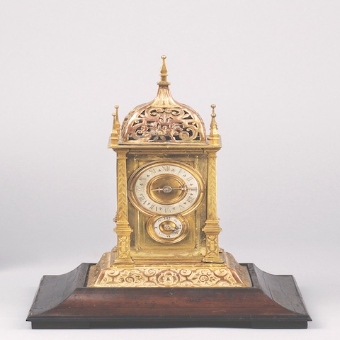 Informations sur l'oeuvre : Type "Türmchenuhr" style Renaissance. Mouvement signé Léonard Harzet. XVIIe siècle. Cuivre, laiton doré, socle en bois.