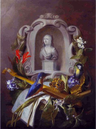 Cette Allégorie de l’ouïe s’inscrit dans la tradition des représentations des cinq sens (la vue, l’ouïe, l’odorat, le goût et le toucher), un genre très prisé au XVIIe siècle. Elle associe la peinture de grisaille avec une nature morte de fleurs, complétée par la présence d’oiseaux. Représentée en grisaille, une sculpture prenant la forme d’un buste encadré par une cartouche montre une jeune fille en train de chanter. Une mésange charbonnière et un martin-pêcheur l’accompagnent. Le titre de sa chanson est inscrit sur les feuillets de musique : Laudet dom(inum), Louez le Seigneur. Différents instruments, parmi lesquels un violon et une flûte traversière, ainsi qu’une horloge renvoient à l’ouïe. L’ornementation florale avec primevères, orties et crocus complète la composition. L’hymne à la création, l’horloge comme symbole du temps qui passe et l’éternelle jeunesse de la fille font allusion au caractère transitoire de la vie humaine et indiquent que le destin de l’homme est entre les mains de Dieu.